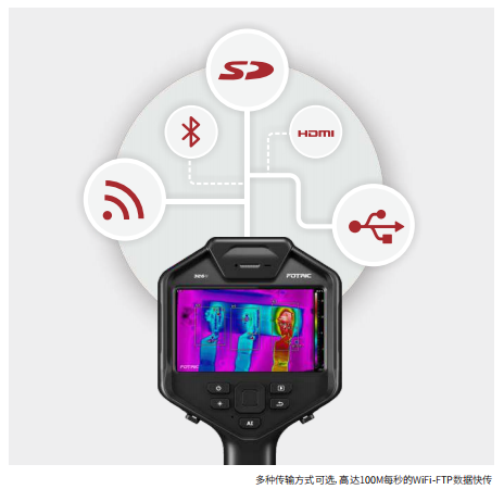 FOTRIC 320Pro系列紅外熱像儀提供豐富的數(shù)據(jù)傳輸接口,包含WiFi-FTP數(shù)據(jù)快傳,Type-C USB3.0有線傳輸,高速SD卡傳輸,4G傳輸以及HDMI、藍(lán)牙接口。