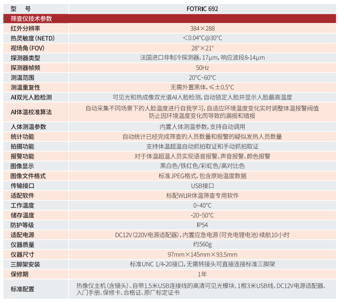 Fotric 692全自動紅外體溫篩查儀采用法國進口探測器,高達110592個有效測溫點,測溫精準且穩(wěn)定可靠。