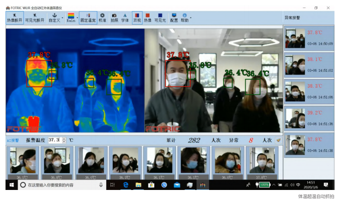 Fotric 692Pro全自動(dòng)紅外體溫篩查儀使用WLIR體溫篩查專用軟件,當(dāng)人群中體溫異常人員觸發(fā)報(bào)警后,系統(tǒng)會(huì)自動(dòng)抓拍一張?bào)w溫異常人員的可見光照片,便于后期工作人員的統(tǒng)計(jì)與分析。