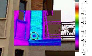 使用澆熱水的方式可以使?jié)B漏部位發(fā)生明顯的溫度分布變化,高水溫、大水量將使熱像檢測(cè)效果更為明顯,該檢測(cè)方法適合外墻表面因物品安裝位置、潮濕等原因無(wú)法直接進(jìn)行熱像檢測(cè)的現(xiàn)場(chǎng),利用水溫的變化,在房間內(nèi)部發(fā)現(xiàn)滲漏部位并加以驗(yàn)證。