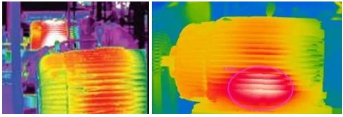 通過(guò)紅外熱成像檢測(cè),可以發(fā)現(xiàn)電機(jī)整個(gè)定子表面溫度非常高,電機(jī)定子兩端溫度較低,中間較高,此類異??赡苡捎谶^(guò)載或者絕緣材料老化導(dǎo)致。并非散熱異常引起。而定子表面局部發(fā)熱,可能由于局部鐵芯損壞、鐵芯片間短路、匝間短路導(dǎo)致。